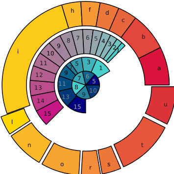 plotsdisplay⁡PieChart⁡A,sector=45..225,annular=2.25..4,color=MediumTurquoise..MediumVioletRed,PieChart⁡B,sector=30..270,annular=1,color=MediumTurquoise..Navy,PieChart⁡A5..10,annular=false,color=Navy..MediumTurquoise,PieChart⁡T,color=Crimson..Gold,explode=seq⁡i,i=j..u,annular=4.25..6