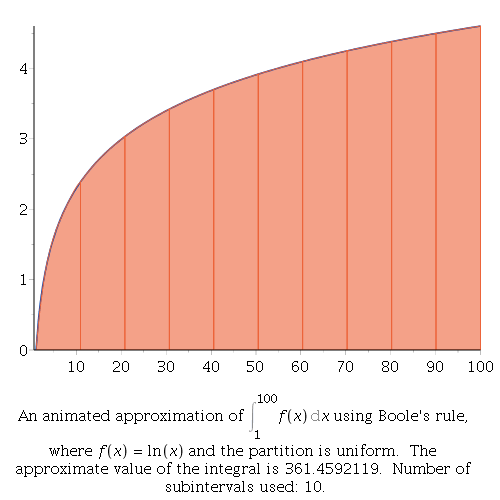 ApproximateInt⁡ln⁡x,x=1..100,method=boole,output=animation
