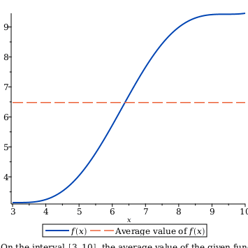 The FunctionAverage(f(x), x=a..b) command returns the average value of the expression f⁡x on the interval from a to b. By using options, you can specify that the command returns a plot or inert integral instead.
