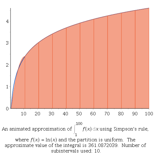 ApproximateIntlnx,x=1..100,method=simpson,output=animation