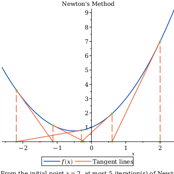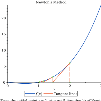 The NewtonsMethod(f(x), x=a) command returns the result of applying 5 iterations of Newton's method for approximating a root. This method is also known as the Newton-Raphson method. By using options, you can specify that the command returns a plot, animation, or sequence of iterations instead.