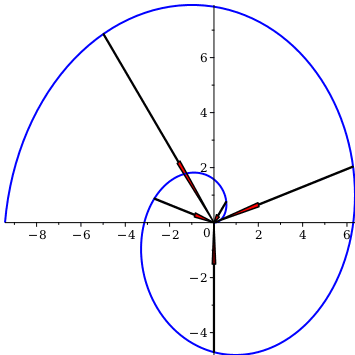 PlotPositionVector⁡R2,v=0..3⁢π,tangent=true
