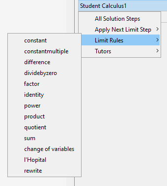 In addition, the Student Calculus1 package contains a ShowSolution command that can be applied to the inert form of the limit operator. The limit operator can be converted to the inert form through the Context Panel by selecting the options 2-D Math≻Convert To≻Inert Form.
