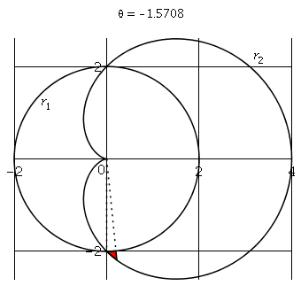 use plots, plottools in module() local R,X1,Y1,X2,Y2,P,P1,P2,G,H,a1,a2; P1 := plot([2,2*(1+cos(theta))], theta = 0 .. 2*Pi, coords = polar,color=black,tickmarks=[3,3]): P2 := textplot({[-1.3,1.2,typeset(r[1])],[3.3,2.2,typeset(r[2])]}); P:=display(P1,P2,scaling=constrained); R := 2*(1+cos(t)): X1 := t->2*cos(t): Y1 := t->2*sin(t): X2 := unapply(R*cos(t), t): Y2 := unapply(R*sin(t), t): G:=proc(t) display(polygon([[X1(t),Y1(t)],[X2(t),Y2(t)],[X2(t+.1),Y2(t+.1)],[X1(t+.1),Y1(t+.1)]],color=red)); end: H:=proc(t) plot([[[0,0],[X1(t),Y1(t)]],[[0,0],[X1(t+.1),Y1(t+.1)]]],style=line, linestyle=dot,color=black): end: a1:=animate(G,[theta],theta=-Pi/2..Pi/2-.1,background=P,frames=62); a2:=animate(H,[theta],theta=-Pi/2..Pi/2-.1,frames=62); print(display(a1,a2)); end module; end use: