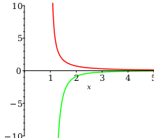 Figure 8.3.2(a) contains a graph of the function fx=1x lnx (in red) and of its derivative (in green).