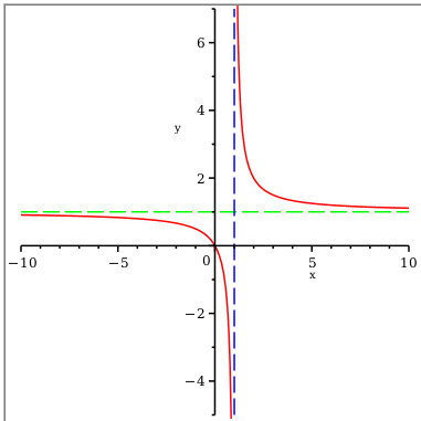 A graph obtained from the Plot Builder, for example, or through any of Maple's ordinary graphing tools will not display the vertical asymptote x = 1 or the horizontal asymptote y = 1.
