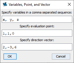 Context Panel: Student Multivariate Calculus≻Differentiate≻Directional Derivative Fill in the "Variables, Point, and Vector" dialog as shown in Figure 4.4.1(a) Click the OK button.