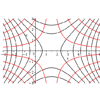 use plots in module() local u,v,p1,p2,p3; u:=x^2-y^2-3*x+2; v:=2*x*y-3*y; p1:=contourplot(u,x=-3..6,y=-3..3,color=black,colorbar=false); p2:=contourplot(v,x=-3..6,y=-3..3,color=red,colorbar=false); p3:=display(p1,p2,scaling=constrained); print(p3); end module: end use: