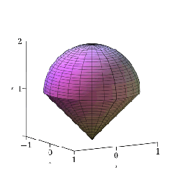 use plots in module() local p1,p2,p3; p1:=plot3d(2*cos(phi), theta=0..2*Pi,phi=0.. (1/4)*Pi,coords=spherical); p2:=plot3d([rho, theta,Pi/4],rho=0.. sqrt(2),theta=0..2*Pi, coords = spherical); p3:=display(p1,p2, scaling=constrained, axes=frame,labels=[x,y,z],tickmarks=[3,3,3],orientation=[-30,80,0],lightmodel=none); print(p3); end module: end use: