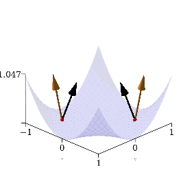 PlotPositionVectorR,x=−1..1,y=−1..1,scaling=constrained,axes=frame,labels=x,y,z,vectorfield=NormalizeF,vectorfieldoptions=color=gold,points=.5,.5,−.5,−.5,normalfield=true,normalfieldoptions=color=black,tickmarks=3,3,2,orientation=−45,65,0
