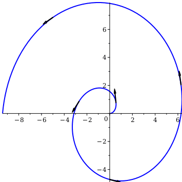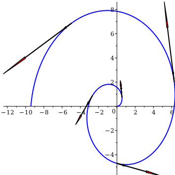 PlotPositionVectorR2,v=0..3π,tangent=true,pvdiff=v