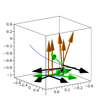 PlotPositionVectorR3,t=0..4π,tangent=true,normal=true,binormal=true