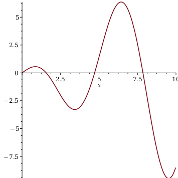 plot⁡x⁢cos⁡x,x=0..10,axis=tickmarks=5,subticks=3