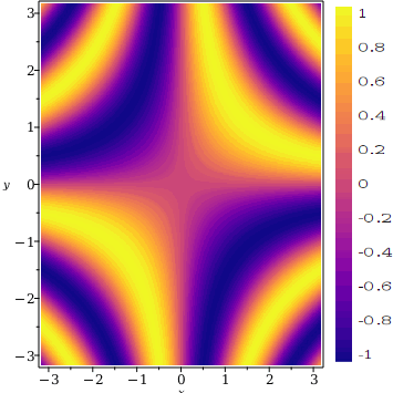 densityplot⁡sin⁡x⁢y,x=−π..π,y=−π..π,axes=boxed,colormap=Plasma