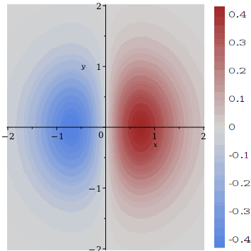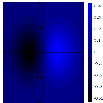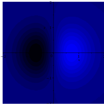 densityplot⁡x⁢exp⁡−x2−y2,x=−2..2,y=−2..2,color=Blue
