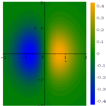 densityplot⁡x⁢exp⁡−x2−y2,x=−2..2,y=−2..2