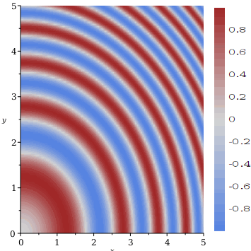 densityplot⁡sin⁡x2+y2,x=0..5,y=0..5,restricttoranges=true