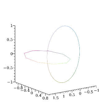 spacecurve⁡cos⁡t+1,sin⁡t,0,numpoints=10,sin⁡t,0,cos⁡t,t=0..2⁢π,t=−π..π,axes=frame