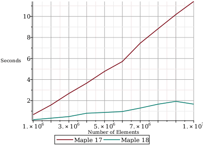 In Maple 18, the sort command takes advantage of multiple cores. The following graph shows the timing difference between sorts of random permutations run in Maple 17 and Maple 18.
