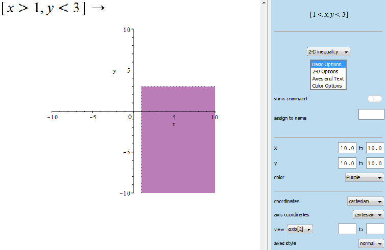 The PlotBuilder provides an easy mechanism to build a wide variety of plots. In Maple 2018, you can now generate plots for inequalities.