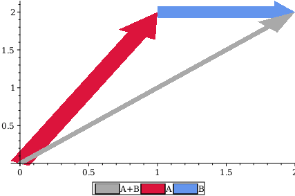 plots:-displayplottools:-arrow0,0,2,2,.05,.2,.1, border=false, color=DarkGrey, legend=A+B, plottools:-arrow0,0,1,2,.15,.3,.15, border=false, color=Crimson, legend=A, plottools:-arrow1,2,2,2,.15,.3,.15, border=false, color=CornflowerBlue, legend=B , size=600,400;