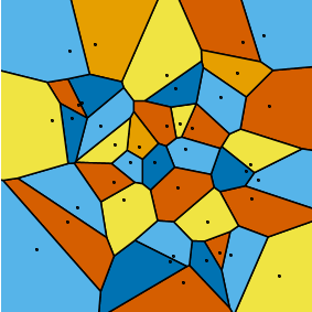 ComputationalGeometry:-VoronoiDiagramLinearAlgebra:-RandomMatrix40,2 , showpoints, symbol=solidcircle, symbolsize=7,colorregions=ColorTools:-GetPaletteDalton;