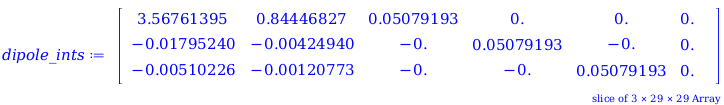 where the first index of the output 3 x 29 x 29 Array selects from the x-, y-, or z-components of the dipole integrals.