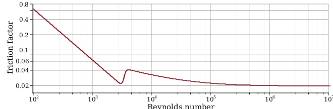 (*) The above function `HeatTransfer.Functions.lambda_Re` is to calculated friction factor for Laminar and Turbulent flow. The fundamental implementation is based on the following equations. Especially, the equation of Turbulent flow is Swamee and Jain's approximation[1] .