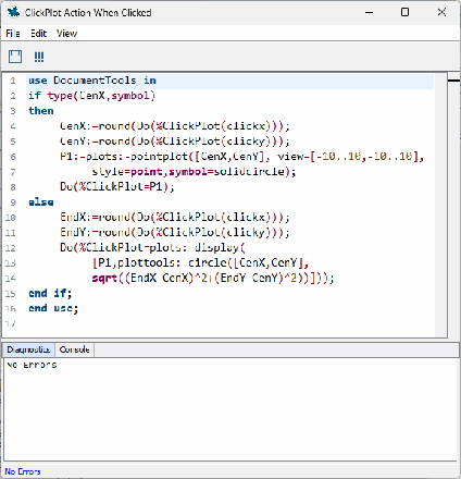For this example, you will be creating an interactive plot of a circle. First, you will click on a point to define its center, then define its radius by clicking on a point that will be on the circle. To set up this interactive plot, you will edit the Edit Click Code section of the plot component.