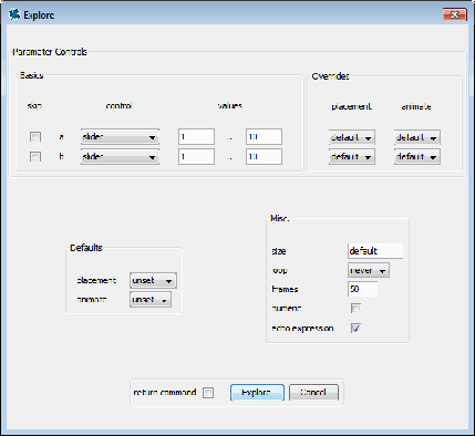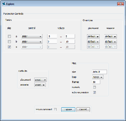 In the dialog that appears, enter 1 for the lower ranges of a and b.  In the Defaults section of the Explore window, select true from the animate list. Now, by default, all parameters that are not skipped will be animated. When you are finished, press Explore.