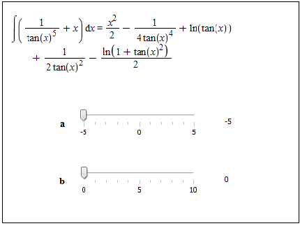 4. A table is generated inline, with a math container for the expression and sliders for the indeterminates a and b.  Move the sliders back and forth to see how they change the solution.