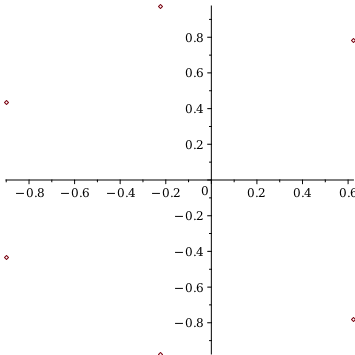 r≔cos⁡2⁢π7+I⁢sin⁡2⁢π7,−cos⁡3⁢π7+I⁢sin⁡3⁢π7,−cos⁡π7+I⁢sin⁡π7,−cos⁡π7−I⁢sin⁡π7,−cos⁡3⁢π7−I⁢sin⁡3⁢π7,cos⁡2⁢π7−I⁢sin⁡2⁢π7