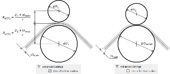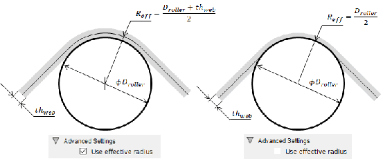The effective roller radius, reff, defines the relationship between the web transfer speed and the roller angular velocity under no-slip conditions, vweb=Reff⁢ωroller; various cases are shown below.