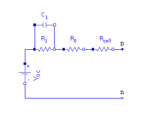 The EquivCircuit.OTCmatrix component is an equivalent-circuit model of a generic battery. The open-circuit voltage is interpolated using the state-of-charge (SoC) and the internal temperature from a matrix. The transient response is modeled by an SoC-dependent resistor-capacitor network.