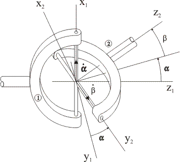 A universal joint, sometimes called a Hooke or Cardan joint, is shown in the diagram below with the two bodies that it connects. A universal joint allows two relative rotations of the two connected frames, about orthogonal axes; this joint type prevents all of the other relative motions of the two frames. In the diagram below, the joint angles, α and β, represent the relative rotation of the end frame,x2y2z2, with respect to the start frame, x1y1z1. In this example, the first rotation, α, is about the x1axis, while the second rotation, β, is about the y2 axis.