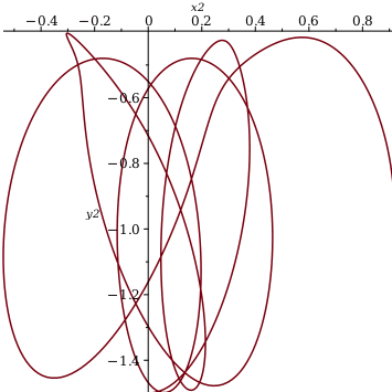 Now consider a similar problem as above, but in addition add a second mass supported from the first by another string, this one of length 1/2 (the double pendulum). The system can be obtained and solved as: