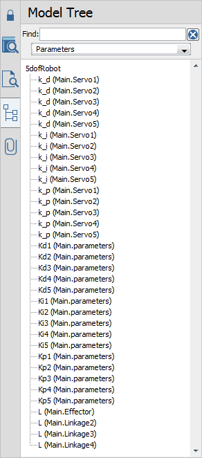 The Parameters view of the Model Tree displays the parameter definitions in your model. Parameter definitions can come from parameter tables, parameter blocks, Modelica Records, or To Variable components.