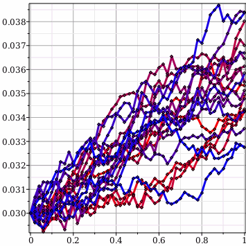 PathPlot⁡X⁡t,t=0..1,timesteps=50,replications=20,axes=BOXED,thickness=3,color=red..blue,gridlines=true