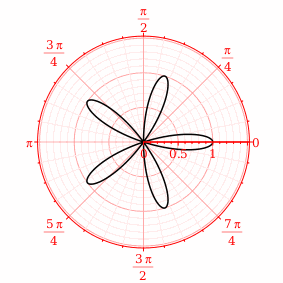 The rose r=cos5 θ is graphed in Figure 7.1.9(a); the rose r=cosθ/5, in Figure 7.1.9(b). The rose r=cos5 θ is drawn with θ∈0,π; the rose r=cosθ/5, with θ∈0,5 π.