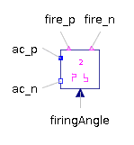 The Voltage Bridge 2 Pulse component has two boolean outputs, firep and firen, that can control the gates of a Thyristor Bridge to rectify a sinusoidal voltage waveform.