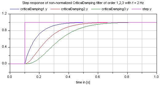 The Critical Damping component models an nth order filter with critical damping characteristics and a cut-off frequency f. It is implemented as a series of first-order filters.