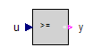The Greater or Equal Threshold (or Greater Equal Threshold) component has a boolean output that is true when the Real input u is greater than or equal to parameter threshold, otherwise it is false.