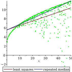 You see that most points are close to the upper boundary given by the curve, but there are some points substantially lower than that. The standard, least-squares regression gives those lower points a substantial weight (their distance from the regression line is squared). The repeated median estimator, however, treats the outliers as "abnormal" values that get less weight; it lies closer to the majority of points.