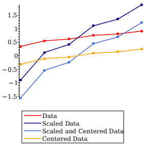 The red line shows the original data and the orange line shows the data minus the center value. The dark blue line shows the data divided by the scale value (the standard deviation of the sample) and the light blue line shows the data minus the center then divided by the scale value (the result of the command used above to compute the standard scores).