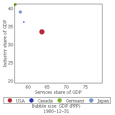The BubblePlot command has also been updated to handle TimeSeries objects. When given a time series, BubblePlot will create an animation that uses the corresponding time series to define the position and size of the bubbles over time. The following plot, taken from the BubblePlot help page, shows the 'Services Share of GDP' vs 'Industry Share of GDP' for several countries over a one year time period as an animation. The bubble size corresponds to the GDP (PPP) value. To view the animation, right-click and choose Animation - Play.