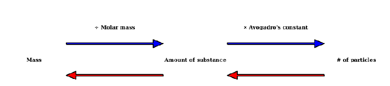 Avogadro's constant can be used as a conversion factor between mass, amount of substance and number of particles (usually atoms or molecules) as summarized by the following diagram: