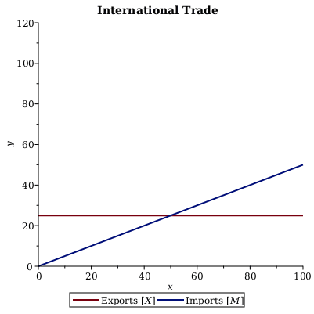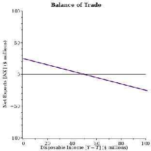 In the basic Keynesian macroeconomic model, we consider the value of total exports (X) to be an exogenous variable, meaning it does not vary with the level of disposable income I (real GDP less taxes [Y - T]), and is instead determined by external factors such as foreign exchange rates and barriers to trade. This is why total exports appears as a horizontal line in the "International Trade" graph below. The level of total imports (M), however, is assumed to be an endogenous variable and so it does vary with the level of disposable income (Y - T). The reasoning behind this assumption is that as income rises, consumers will spend more, both on domestic products and imported products. The degree to which a change in disposable income causes a change in total imports is determined by the marginal propensity to import (MPM). So, we can write total imports as the following function:   M=MPMYT.