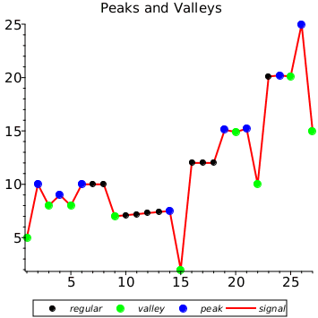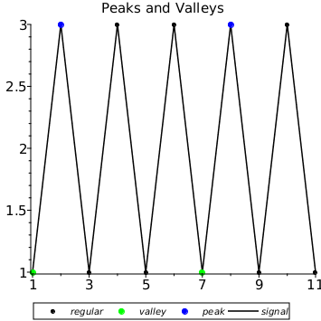 FindPeakPoints1,2,1,2,1,2,1,output=plot,plotincludepoints=peaks,regular,valleys