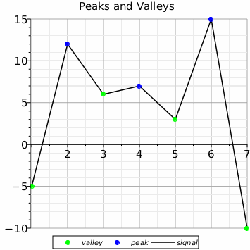 Note: Peaks and valleys are found by considering the entire neighborhood of the candidate points, not just the closest points on the left and right.