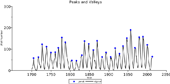 BFindPeakPointsdata,output=record,plotincludepoints=peaks,peakpointplotoptions=symbolsize=10,minimumprominence=25,labels=Year,Wolf Number,labeldirections=horizontal,vertical,size=1000,500,view=1650..2050,0..300,xtickmarks=seq1700..2050,50: